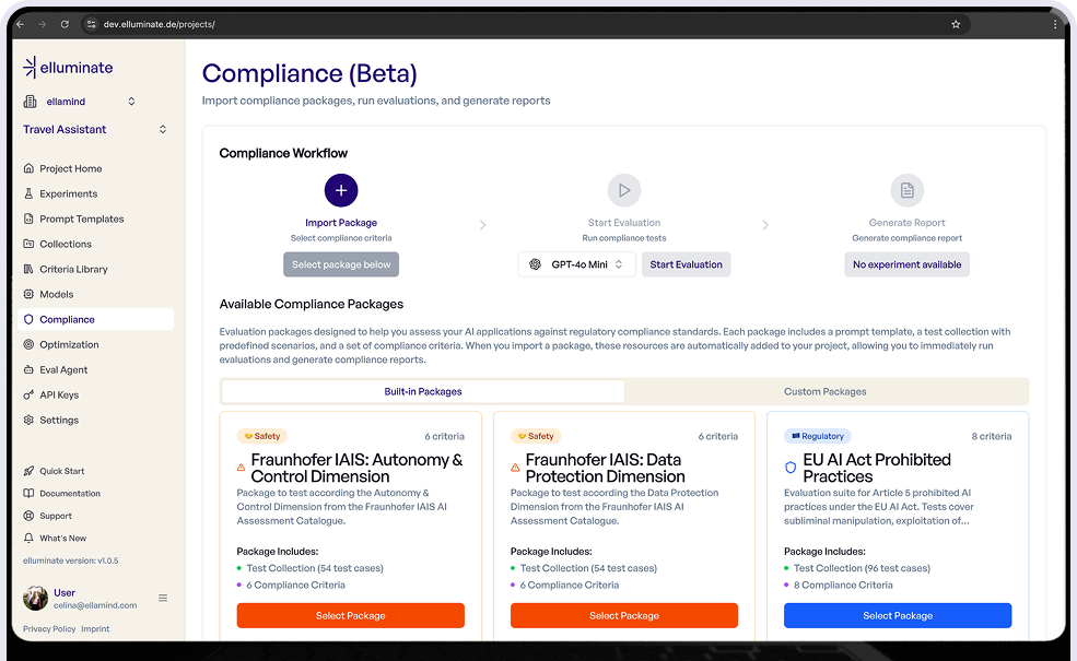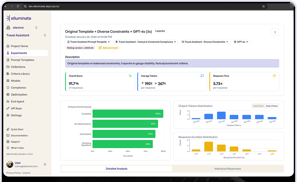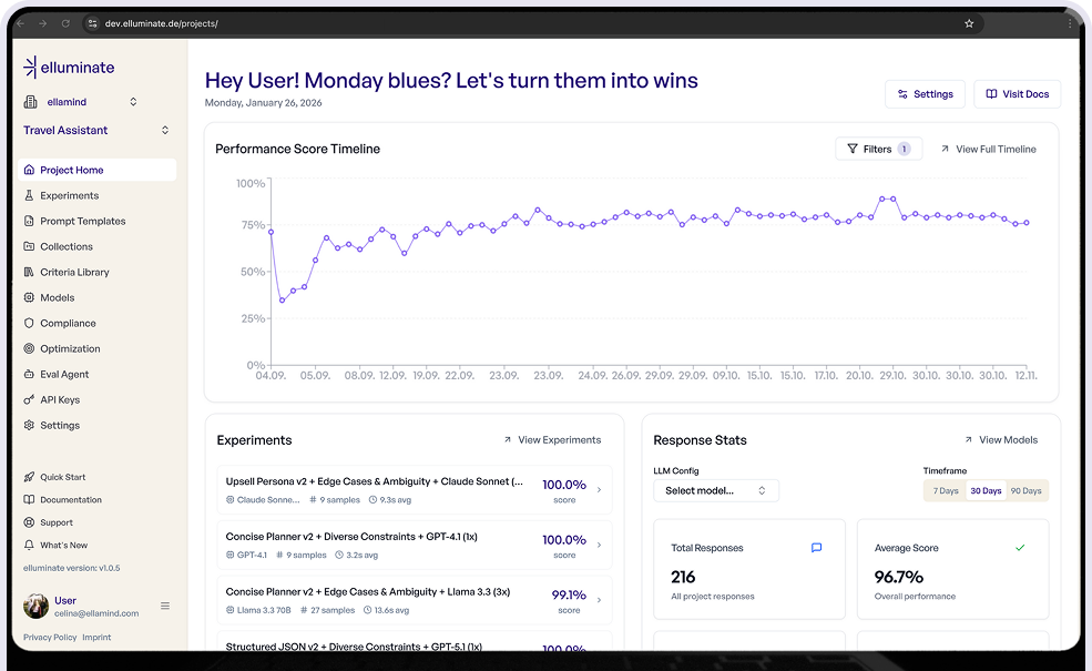 elluminate ist die Evaluationsplattform für Teams, die KI-Produkte sicher entwickeln, auf den Markt bringen und skalieren möchten. Sie hilft Teams dabei, von „wir glauben, dass es funktioniert“ zu „wir wissen, dass es funktioniert“ zu gelangen – bevor Kunden oder die Realität die Schwachstellen entdecken.